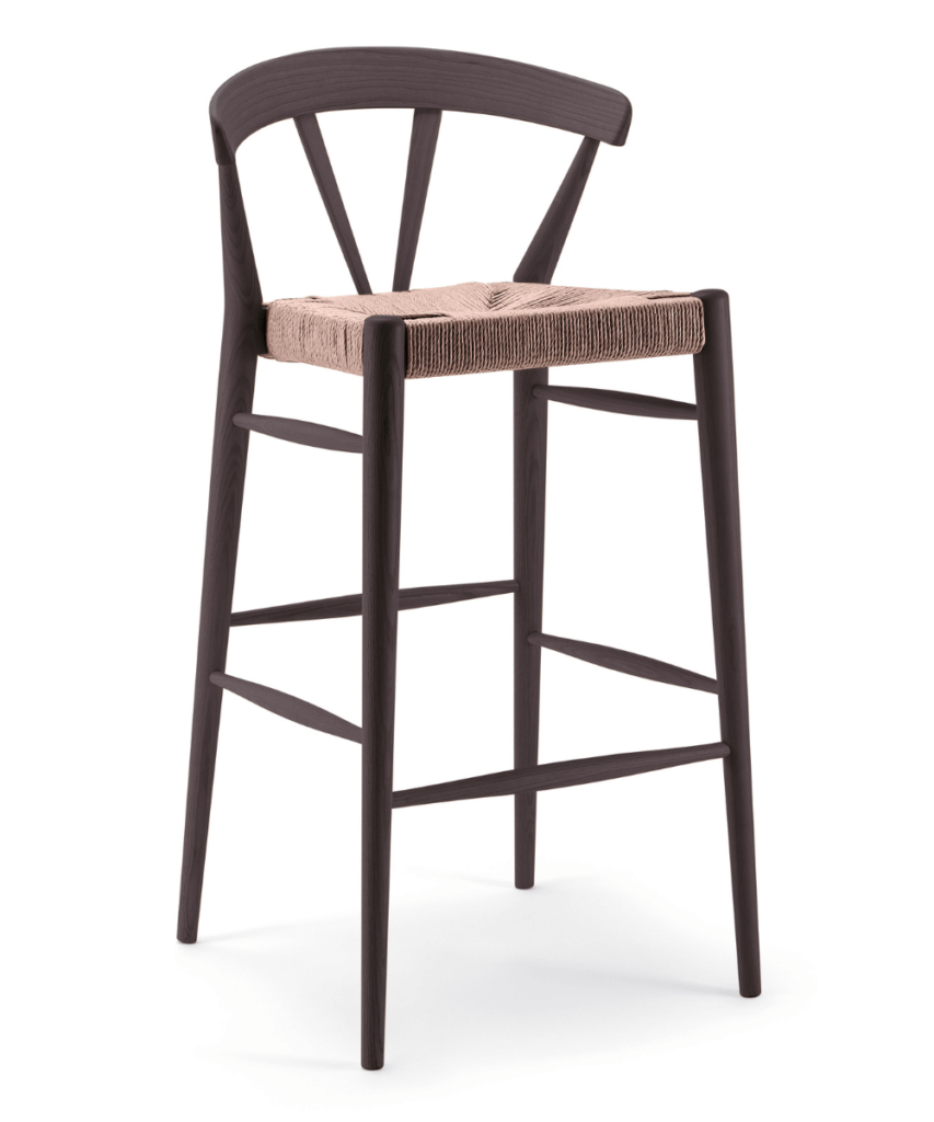 כסא בר עשוי עץ אשה. ניתן להזמין עם מושב ראטן טבעי ובמבחר גווני עץ שונים.